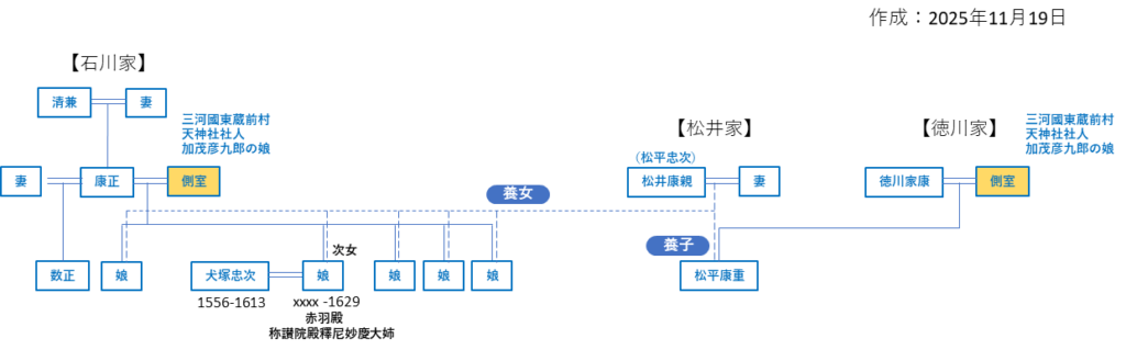 「犬塚忠次」の妻は、史料によれば「赤羽殿」(松井家譜) と呼ばれ、石川右馬允康正の側室「加茂彦九郎」の次女と書かれています。一旦、松井松平周防守康親の養女となってから、忠次に嫁いでいます。