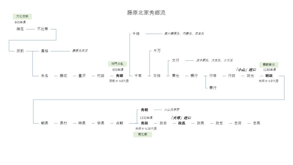 藤原北家の支流の人物です。天慶2年(940)に「将門の乱」を平定した「藤原秀郷」から数えて16代目の子孫であり、また治承4年(1180)に「源頼朝」の挙兵に応じた「小山下野守判官藤原朝政」から数えて7代目の子孫が「秀政」になります。